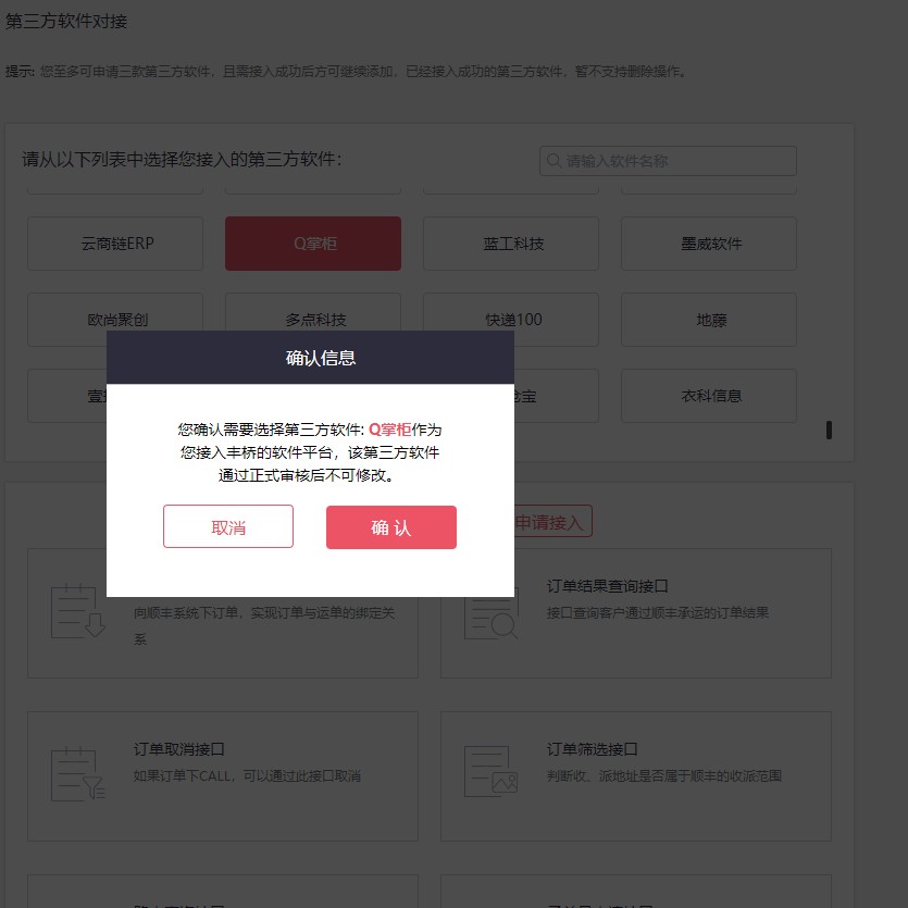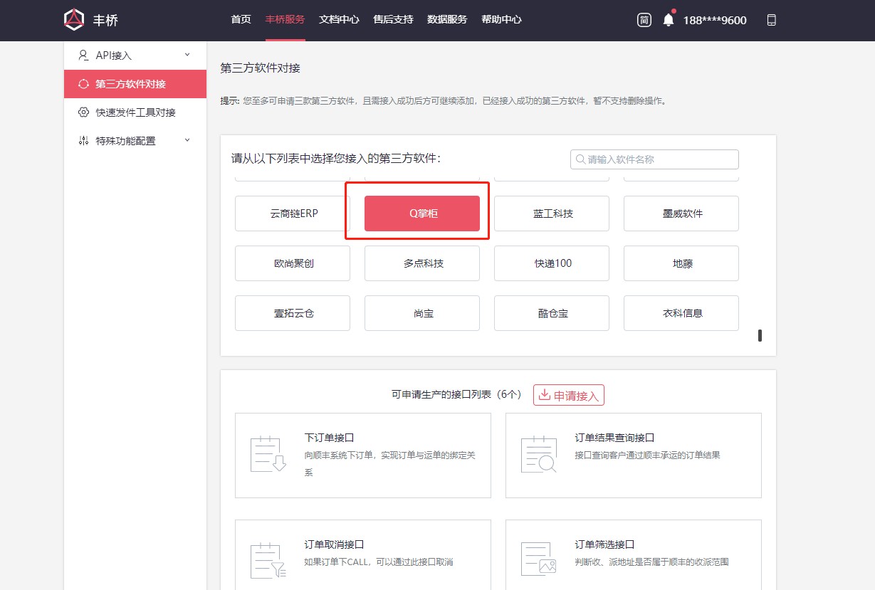 进入丰桥后台后,点击第三方软件对接,选择“Q掌柜”