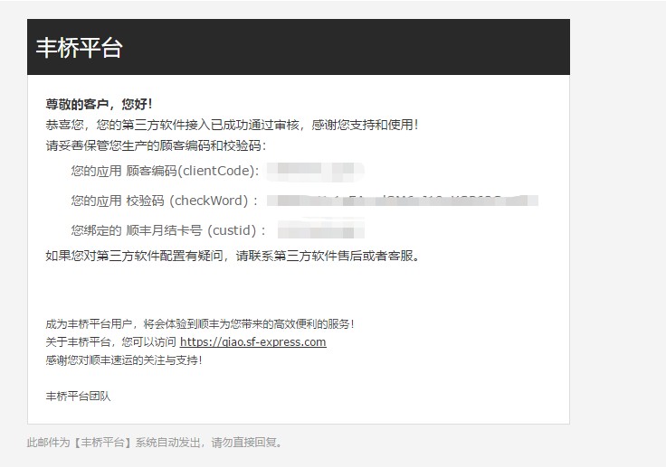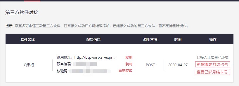 下一步,点接口上的添加按钮,之后确认对接,确认了之后,如果还没完善账户信息,会提醒您完善,完善了之后顺丰审核通过,您会获得一个效验码、一个顾客编码,保存下来等下用