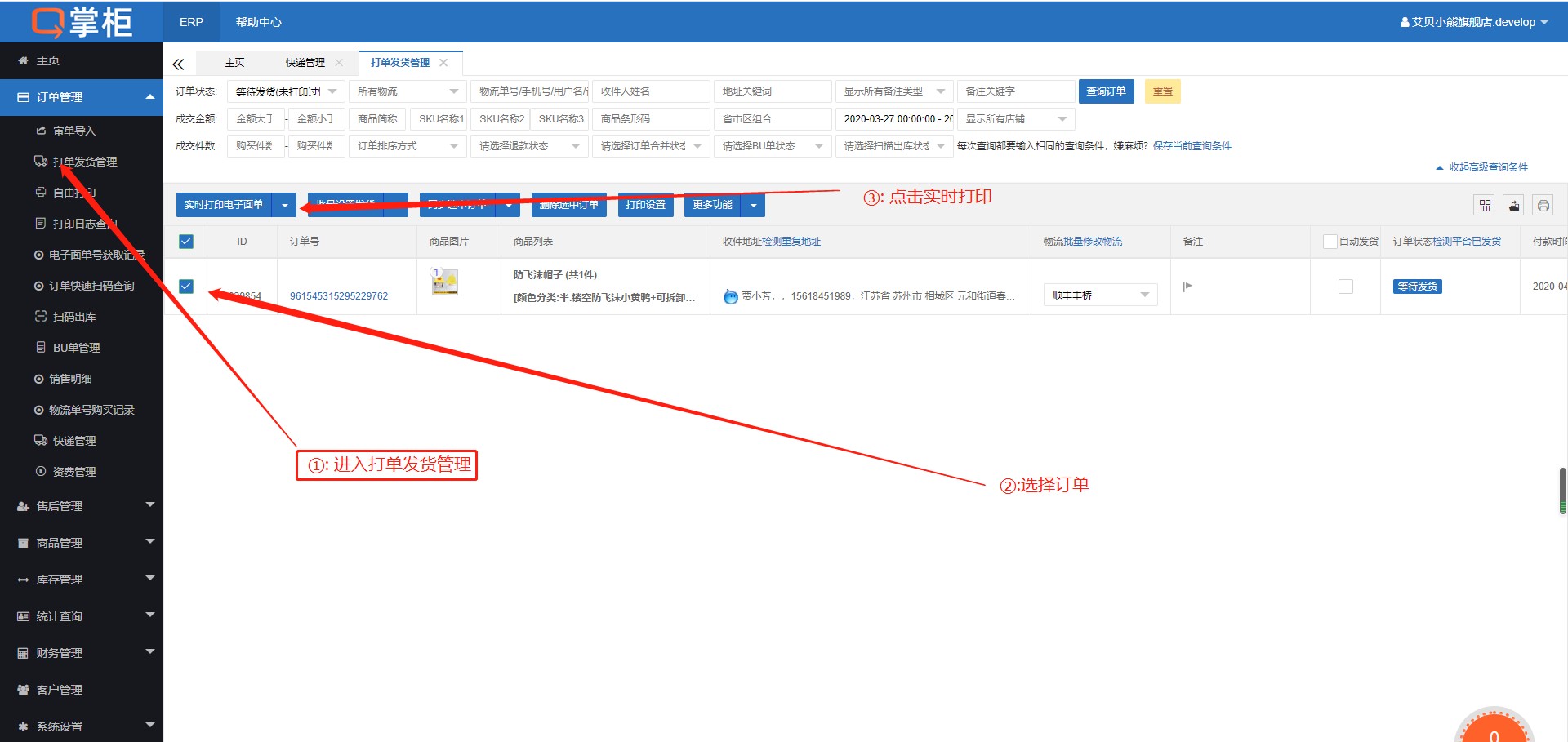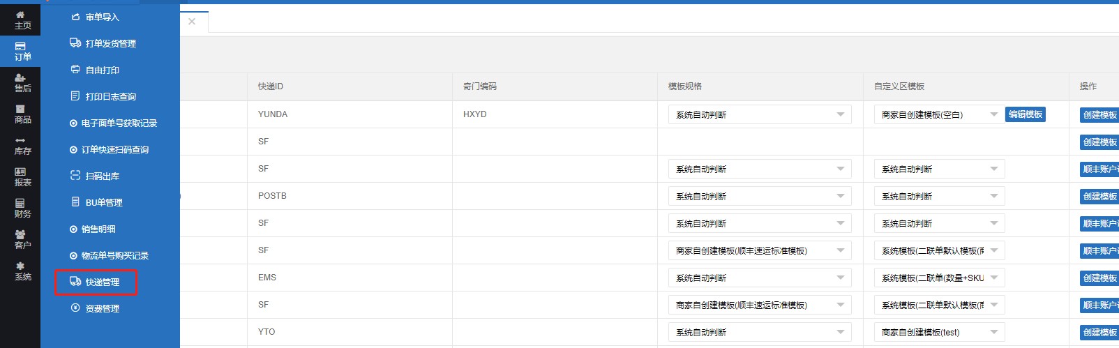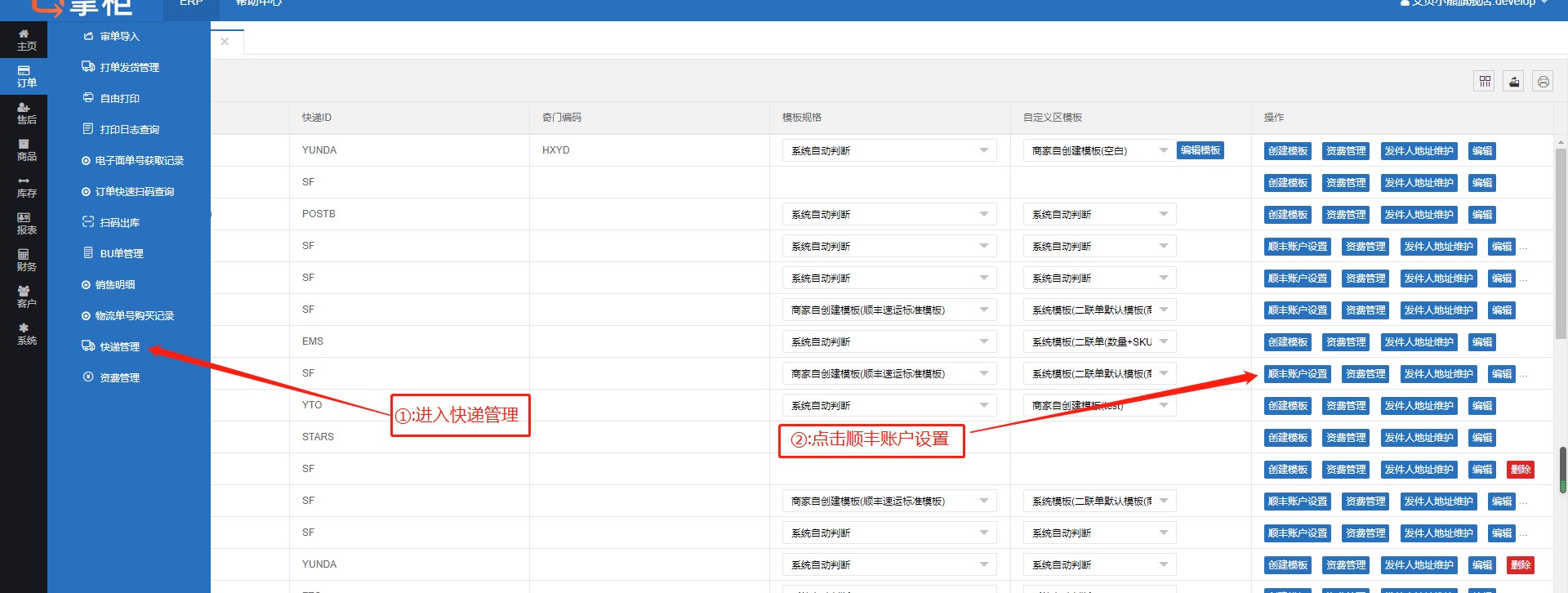 之后,进入“Q掌柜”打印软件,选择订单管理->快递管理 然后点击顺丰账户设置