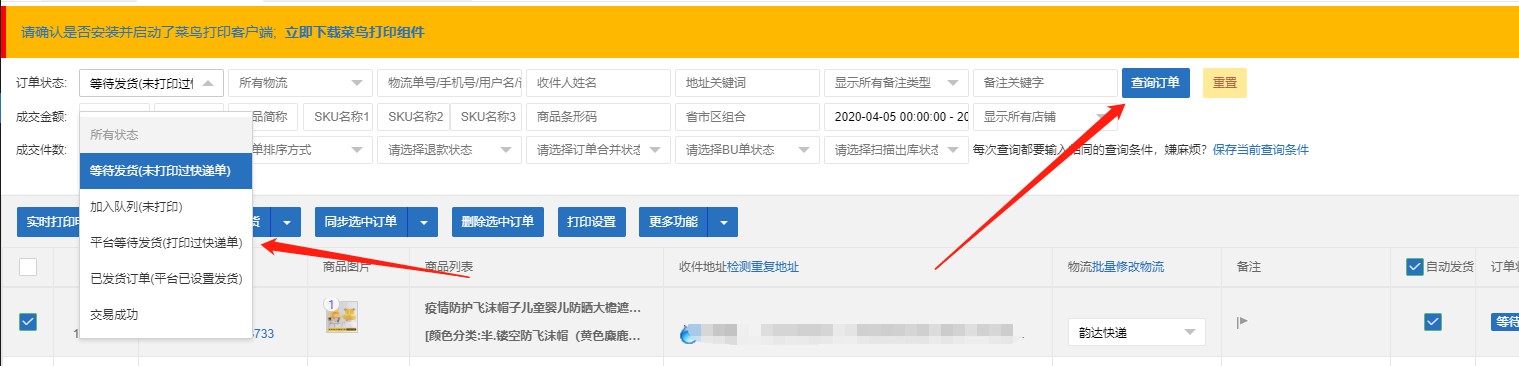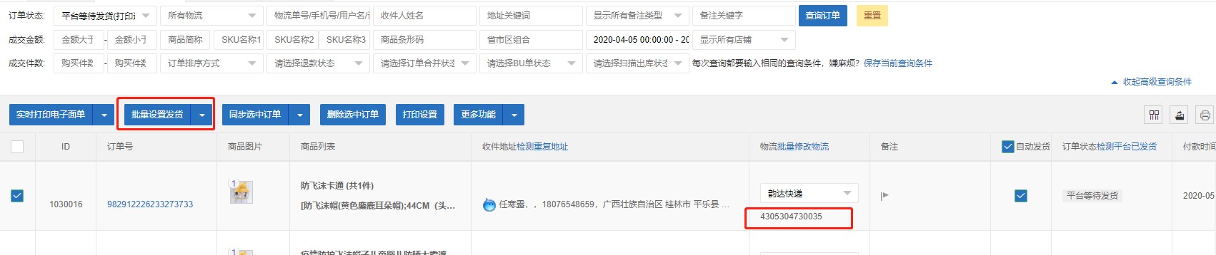 第六步,推送后提示成功, 订单状态改为 平台等待发货,点击查询,然后查看刚才推送的订单,勾选后点击批量设置发货即可 (PS: 一定要查看对应的快递单号是否存在哦!)