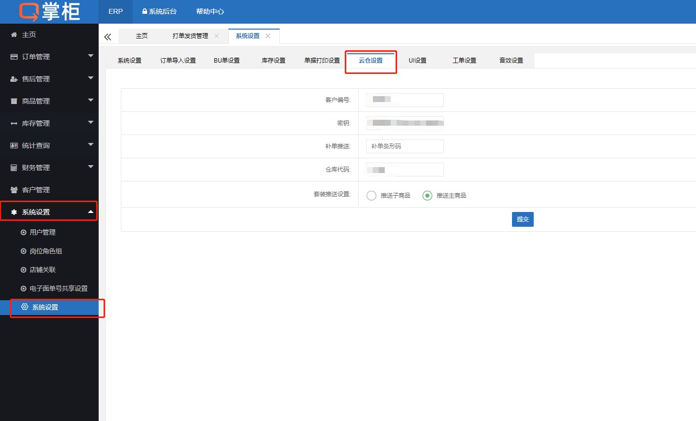 第三步,进入Q掌柜软件平台,选择系统设置->系统设置->云仓设置,填写云仓客户编号、密钥、仓库代码。点击提交即可