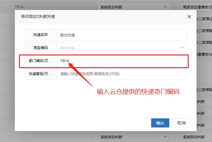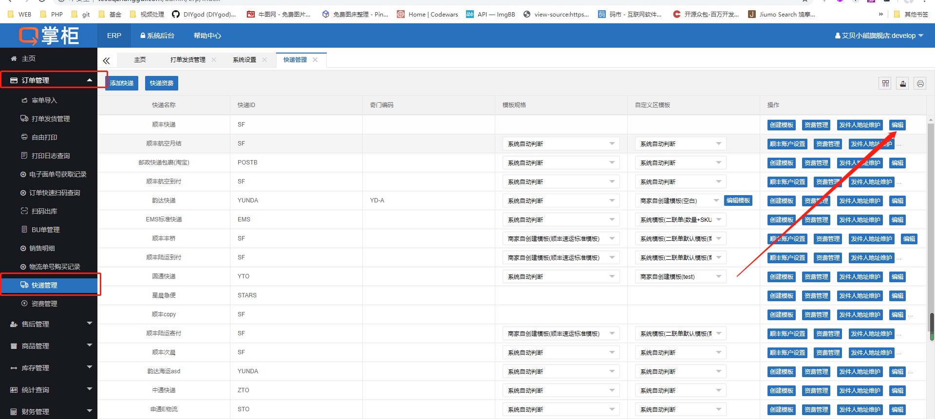 第四步,进入Q掌柜软件平台 选择 订单管理->快递管理 点击编辑按钮 输入对应快递的奇门编码 (PS: 对应快递的奇门编码可询问同创云仓售后人员)