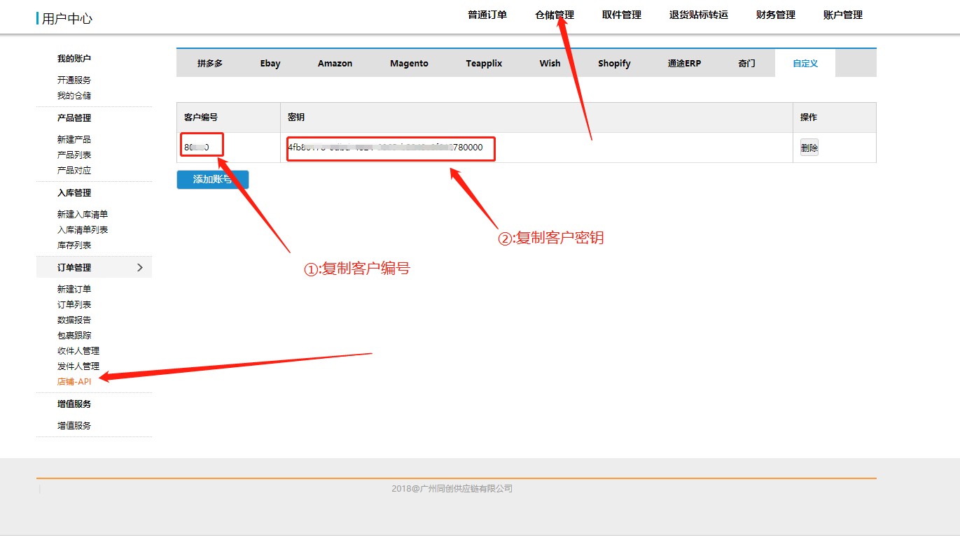 第一步,进入同创后台,选择仓储管理->店铺-API 复制客户编号和客户密钥,保存到文本文档