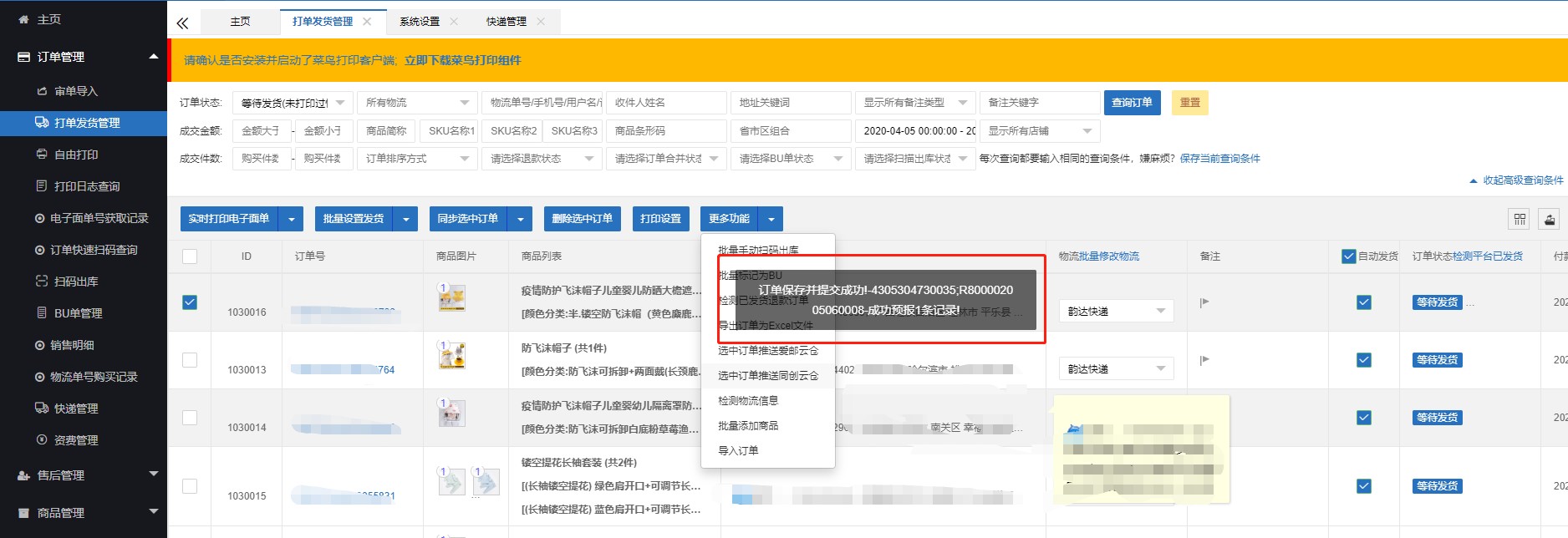 第五步,进入订单管理->打单发货管理 选择需要推送到云仓的订单,然后点击更多功能的 V 按钮推送到开通的云仓即可,推送后请至云仓核实对应的订单信息